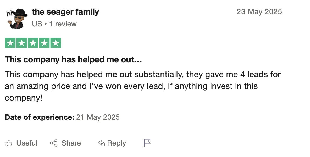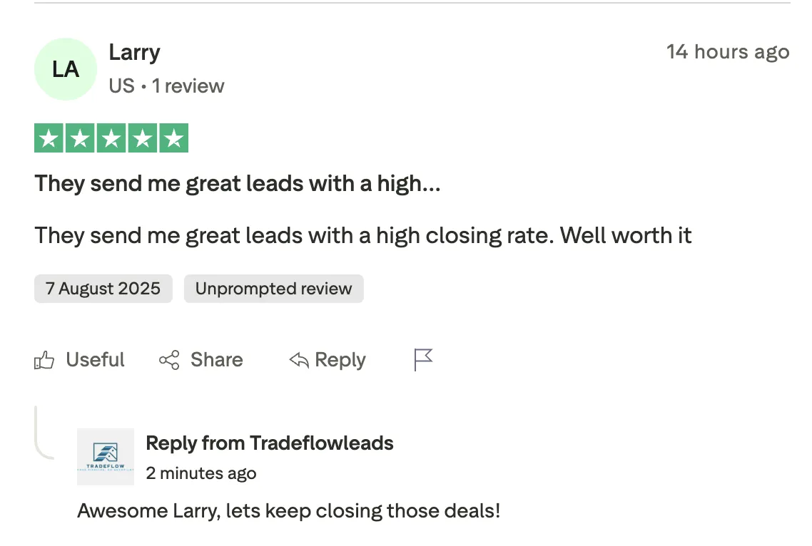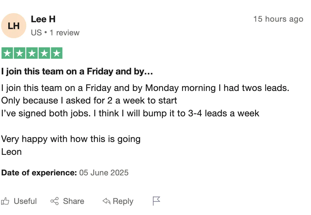 How Matthew closed 17 out of his first 20 leads: "Why I reached out was...I'm gonna need a good team behind me to keep things busy, as I need a regular influx of new leads. I've been working with them for over a month and a half now or so, probably twenty to thirty leads just based off of what I've wanted to pay for so far... I wanna say all of them, but like three have closed...It's been awesome. The leads have been genuinely better than I could have expected."